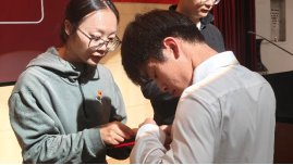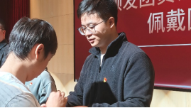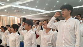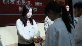随后,老师们为新团员颁发团员证、团章并佩戴团徽;全体新团员面向团旗庄严宣誓。新团员代表陈海鑫上台发言,承诺将在学习和生活中起模范带头作用。优秀团员代表曾乐平结合自身经历向新团员传授经验,鼓励新团员在学习生活中积极进取,不断进步。