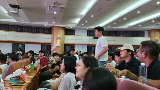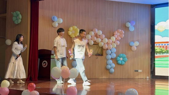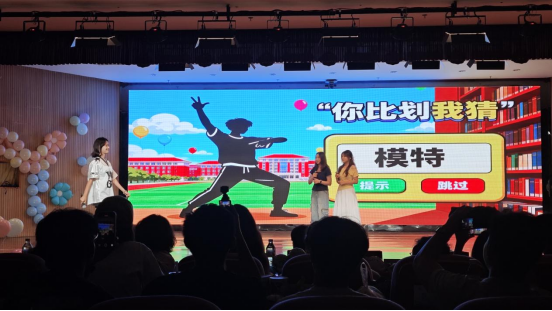 为让2025级新生更快融入集体,晚会特别设置两个中场互动环节,以游戏、生日祝福等形式传递温暖。第一个中场环节中,身着可爱玩偶服的 “使者” 上台为新生送上惊喜礼物,随后的 “你比划我猜” 游戏更是点燃参与热情 ——3名领航导师率先登场 “打样”,用生动的动作与语言描述词语,为新生做出示范;后续四组新生踊跃举手参与,在1分30秒的计时挑战中默契配合,不仅收获了精美的礼品,更在互动中结识了新伙伴。