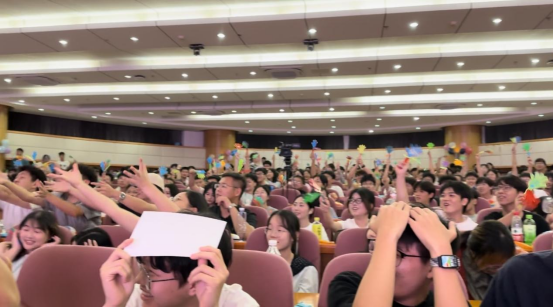 第二个中场环节则充满“专属浪漫”。主持人首先带领全场为当天生日的 2025 级新生送上祝福,“生日快乐” 的合唱声温暖而真挚,玩偶使者为过生日的新生送上定制蛋糕、气球与生日礼品,让新生在异乡感受到“家”的温暖。随后的“趣味问答”与“看图猜成语”游戏围绕校园知识展开,从 “厦门华厦学院校长名字”“信息与智能机电学院专业数量”到“学院创立时间”,新生们积极举手抢答,在答题过程中加深对学校与学院的了解;“一拍即合”“拨云见日”“星罗棋布”等成语的猜测则考验着大家的智慧,现场氛围轻松愉悦,笑声不断。
