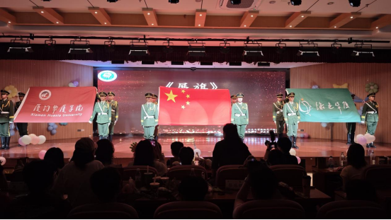 晚会在庄严的氛围中拉开帷幕。厦门华厦学院国旗护卫队率先登场,带来节目《展旗》—— 队员们身着整齐制服,迈着铿锵有力的步伐走向舞台,展旗动作利落标准,每一个细节都尽显对国旗的崇敬与守护的决心。随后,全场起立奏唱国歌,嘹亮的歌声回荡在俊秀报告厅内,不仅展现了华厦学子的爱国情怀,更让2025级新生在入学之初便感受到了集体的凝聚力与仪式感。