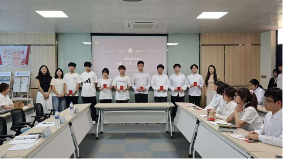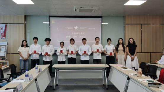 王亚凡老、练小慧老师及郑旭雯老师为2025年9月发展团员颁发团徽、团章与团员证。熠熠生辉的团徽象征着共青团的荣誉与使命,鲜红的团员证标志着2025年9月发展团员正式加入先进青年集体。2025年9月发展团员们双手接过信物,眼神坚定,教室内的庄重氛围在此刻达到高潮,每一个动作、每一份眼神都承载着青年对组织的敬畏与对未来的憧憬。