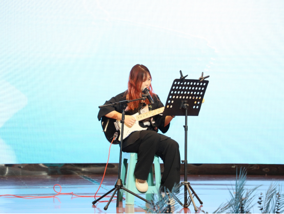 学长学姐们在舞台上散发着无限光芒,2025级的新同学们也不甘示弱。2025级音乐学的同学吴雯娜、林芊慧同学分别带来《我的秘密》与《绿光》,在极富节奏感的音符间,同学们不约而同地挥舞着荧光棒,享受歌曲的快乐;来自说唱协会的侯帅与张宇琪同学用一段原创音乐《the moment》燃爆全场,在一枚枚说唱的鼓点与押韵中,忘却一切烦恼与疲惫,全身投入到音乐的缤纷世界里;当吉他调弦的声音出现在红色幕布后,吉他协会的冼晓晴同学坐在舞台中央,用一把吉他奏响《紧急联络人》,配合着一幕幕MV的画面,不知道台下的新同学是不是也思绪万千,有的是对家人朋友的不舍,还有对自己未来的描绘与展望……