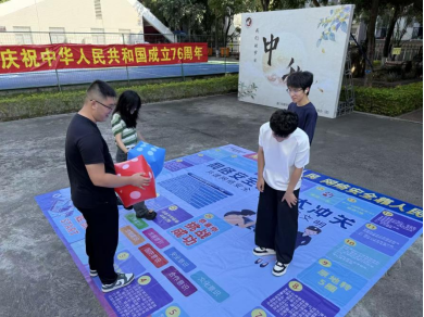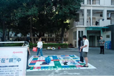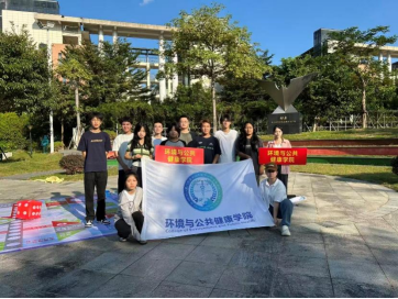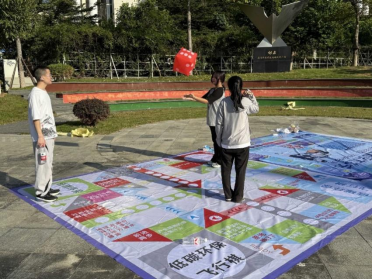 为庆祝中华人民共和国七十六周年华诞,涵养家国情怀、筑牢国家安全基石,深入学习宣传国家安全教育,深化大学生国家安全意识,环境与公共健康学院于2025年10月7日下午在嘉禾苑一站式学生服务中心、杏坛广场举办“乐在‘棋’中”国家安全主题真人版地面飞行棋活动。